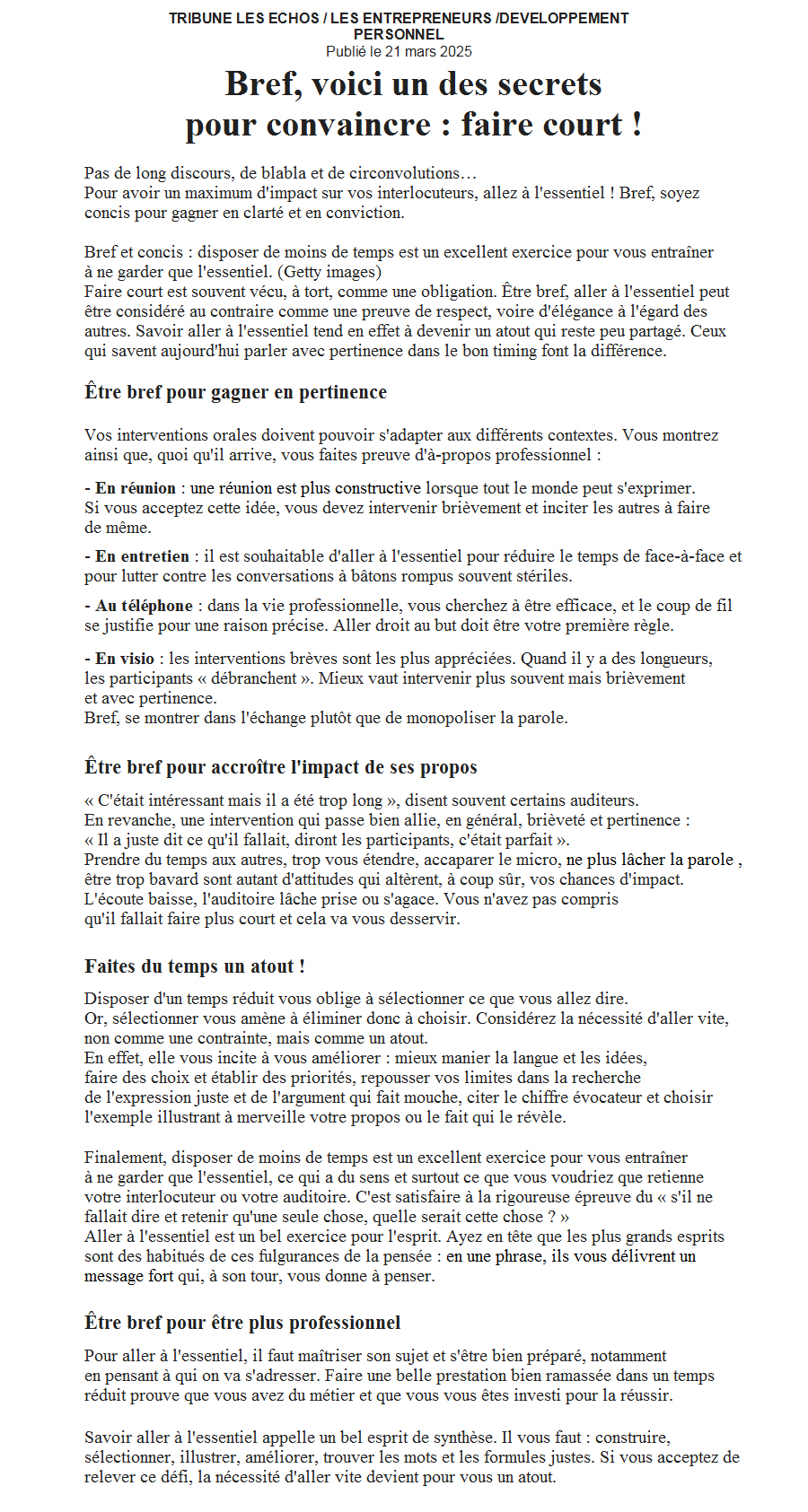 Clairement, qu'elle soit plus pertinente. Pourquoi ? Parce qu'elle oblige à une préparation plus soignée. Elle incite, parce qu'il va falloir faire court, à sélectionner les arguments en fonction de l'interlocuteur ou de l'auditoire. Qu'est-ce qu'il peut entendre ? Qu'est-ce qui peut lui être utile ? Qu'est-ce qu'il attendait ? Par ailleurs, l'intervention orale courte provoque un exercice de discernement : sur quoi repose mon raisonnement ? Est-ce que mes arguments tiennent la route ?